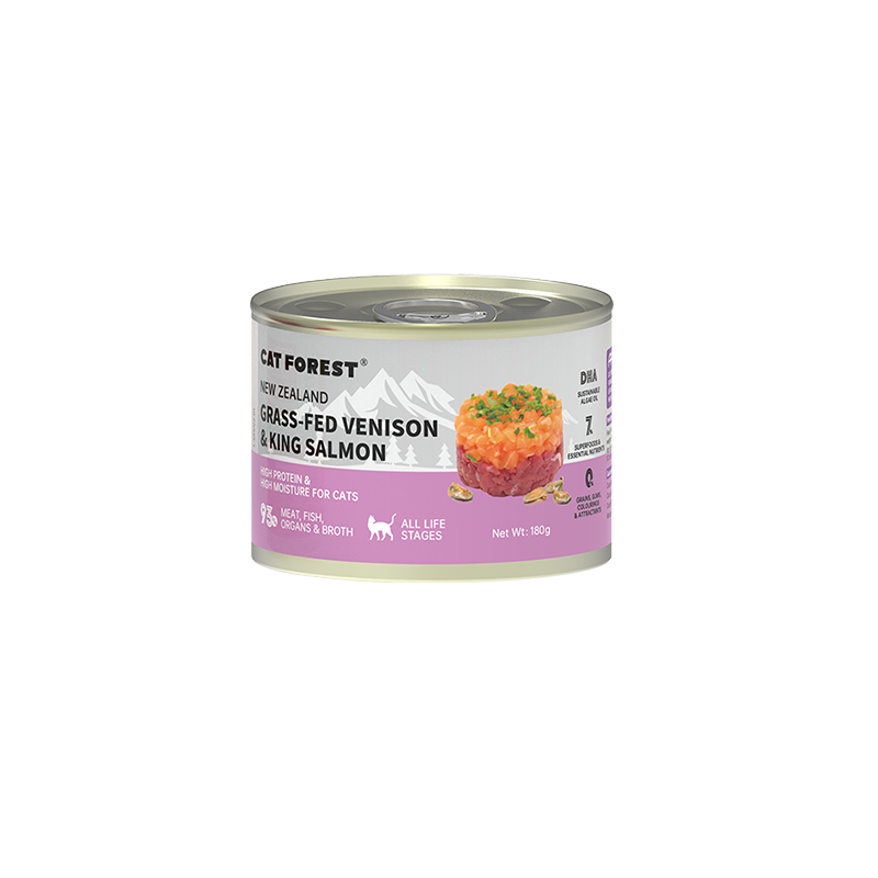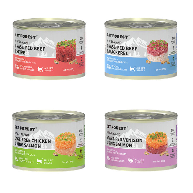 CAT FOREST wet cat food is made with 93% premium New Zealand-sourced meat, fish, organs, and broth, providing a complete and balanced diet suitable for all life stages. These recipes meet AAFCO standards, with no artificial colors, flavors, or preservatives, and are free from grains, gums, dairy, and potatoes. Each can promotes health and vitality for cats, supporting a natural, wholesome diet with responsibly sourced ingredients.