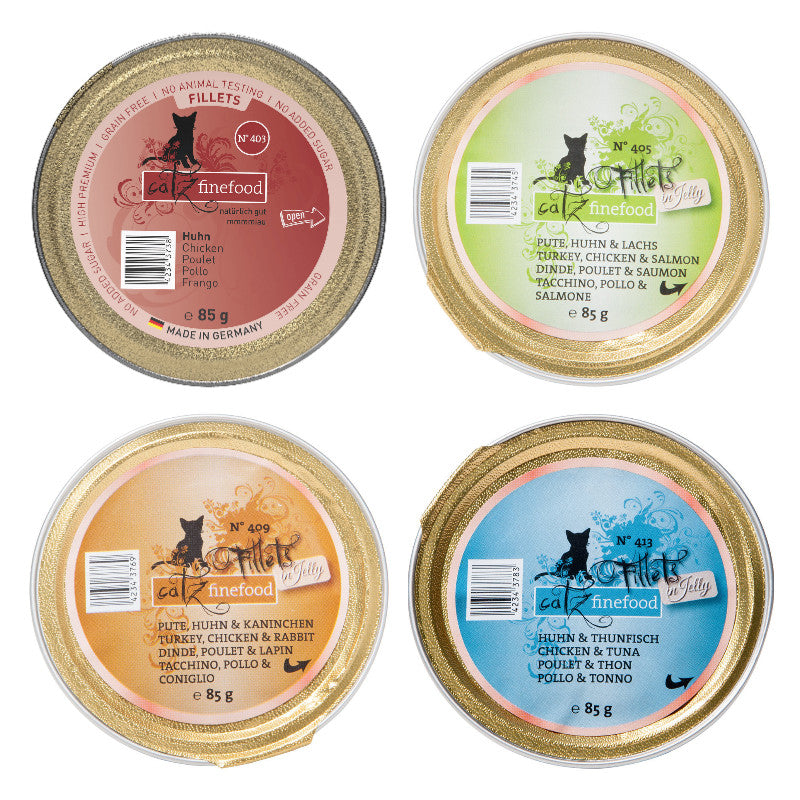 Catz finefood Fillets in Jelly stands for delicious wet food made from the finest fillets, which is combined with a tasty jelly. The high-quality fillet meat comes exclusively from Germany. There are no grains, colorings, preservatives, added sugar, genetic engineering or animal testing in the six tasty variations. Thanks to the open declaration, catz finefood fillets offers a high degree of transparency and guarantees wet food of the highest quality.