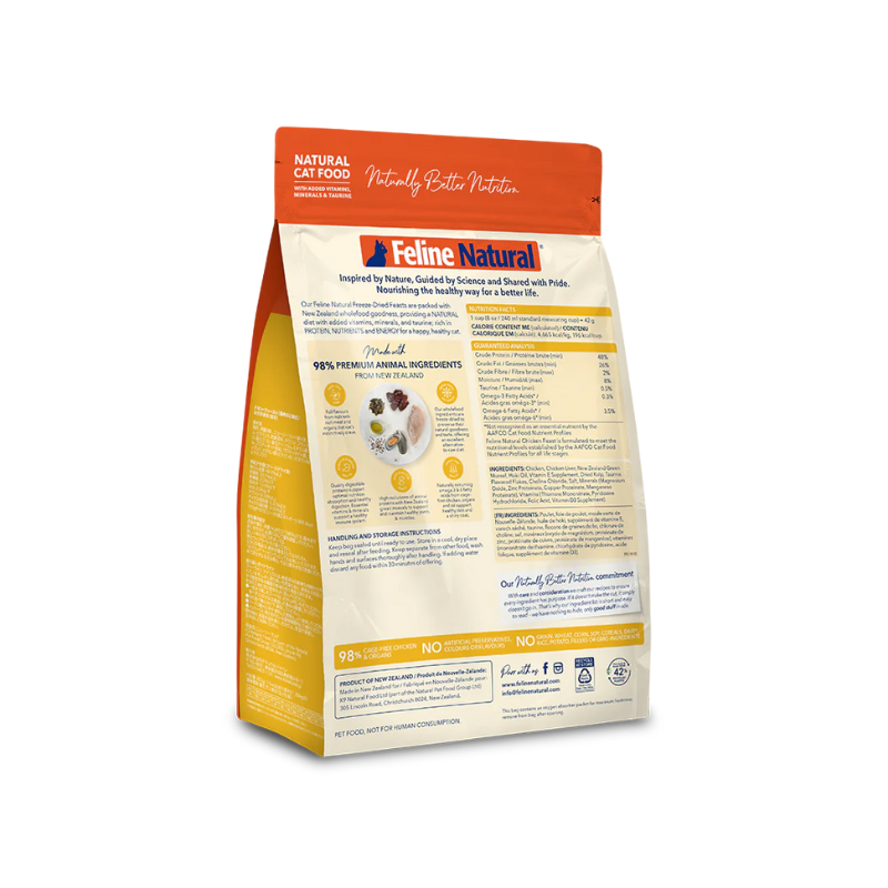 Our complete and balanced Freeze-Dried New Zealand Chicken Feast contains 98% Cage-Free Chicken and Organs with New Zealand Green Mussels, Kelp, Taurine, Flaxseed Flakes, Oil, Vitamins, and Minerals in support of your cat's whole-body health.