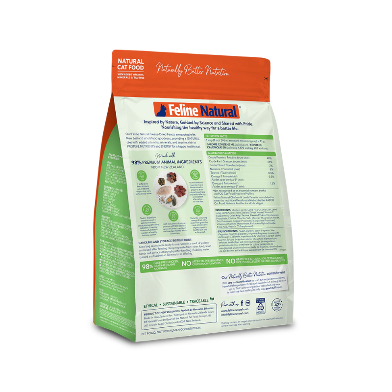 Our complete and balanced Freeze-Dried New Zealand Chicken & Lamb Feast contains 98% Cage-Free Chicken, Grass-Fed Lamb, and Organs with New Zealand Green Mussels, Kelp, Taurine, Flaxseed Flakes, Vitamins, and Minerals in support of your cat's whole-body health.