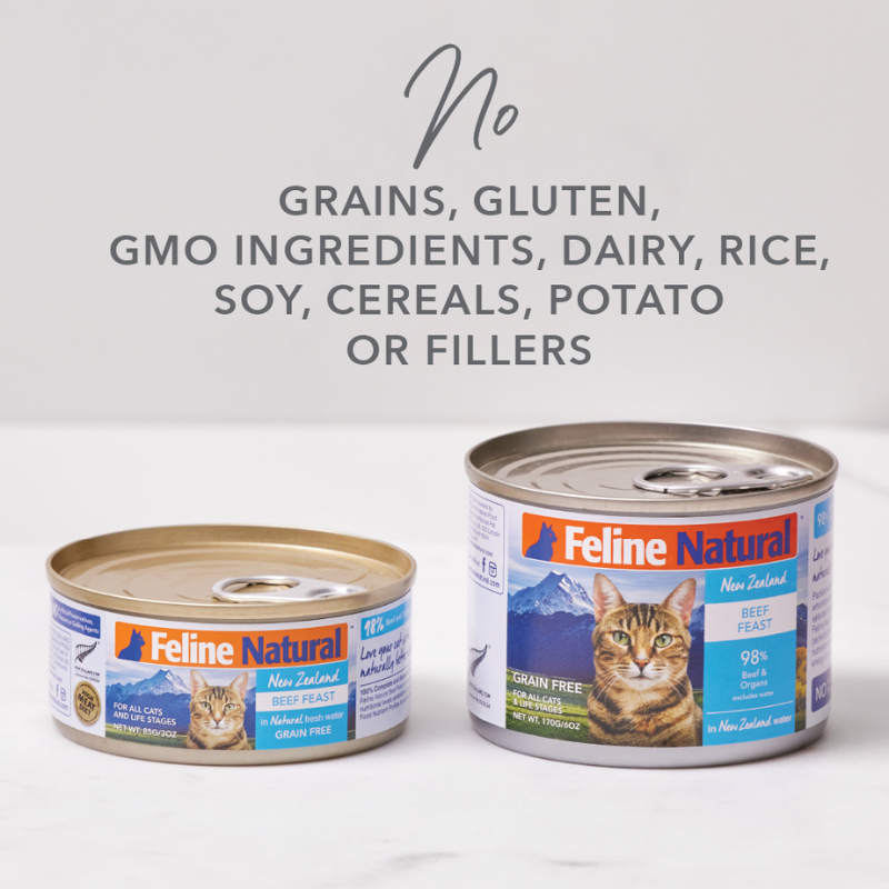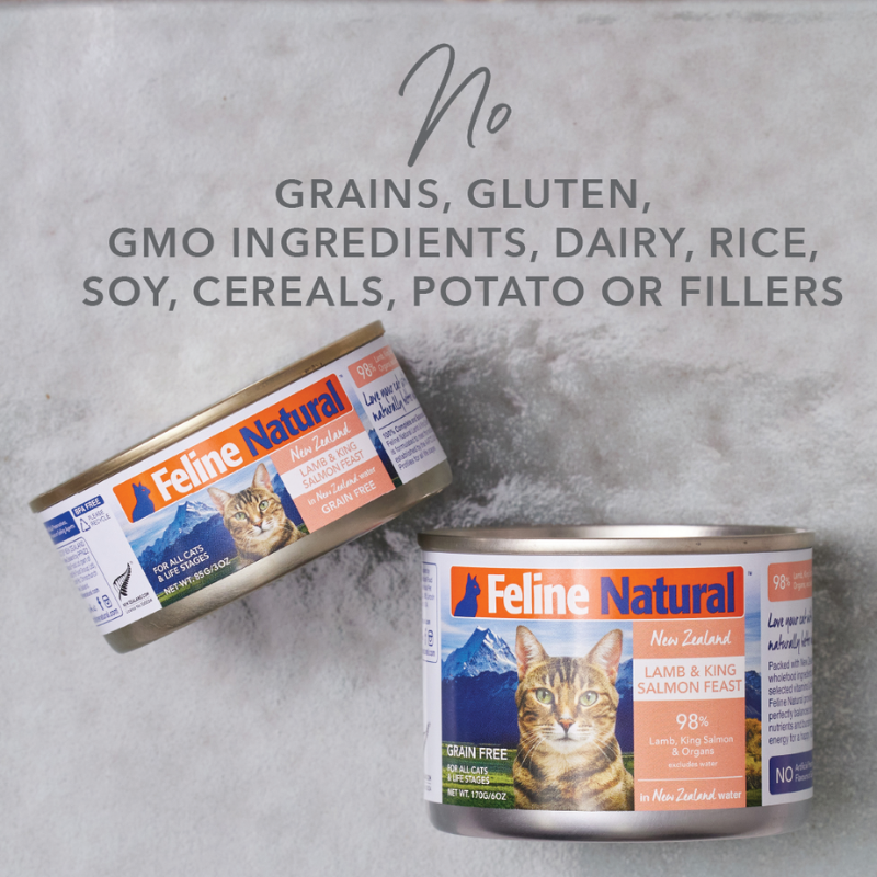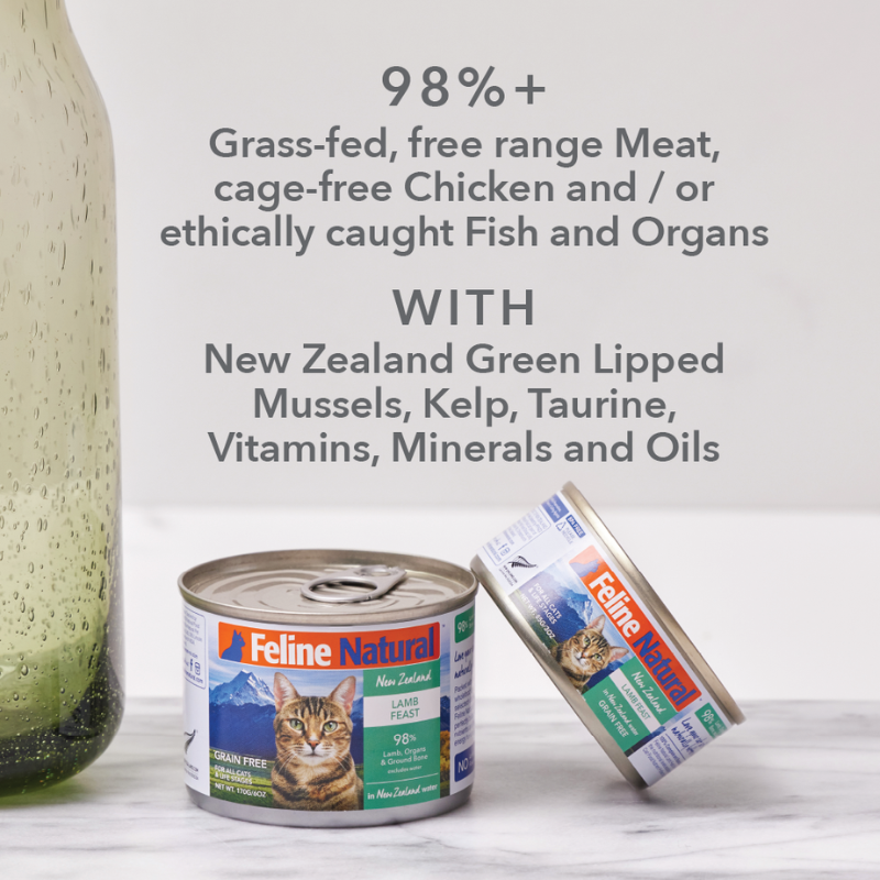 Our canned cat food is complete & balanced, nutrient-dense, and made with fresh New Zealand Water for added hydration. Feed Feline Natural canned cat food as a complete meal, simply open the lid, place in your cat's bowl, stir the meat and liquid together, and serve.
