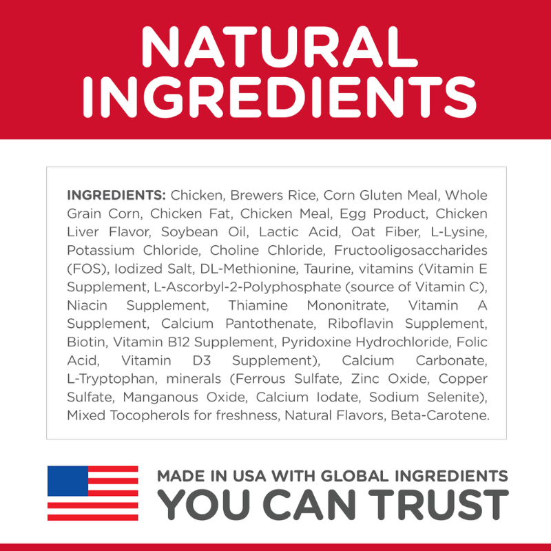 Chicken, Brewers Rice, Corn Gluten Meal, Whole Grain Corn, Chicken Fat, Chicken Meal, Egg Product, Chicken Liver Flavor, Soybean Oil, Lactic Acid, Oat Fiber, L-Lysine, Potassium Chloride, Choline Chloride, Fructooligosaccharides (FOS), Iodized Salt, DL-Methionine, Taurine, vitamins (Vitamin E Supplement, L-Ascorbyl-2-Polyphosphate (source of Vitamin C), Niacin Supplement, Thiamine Mononitrate, Vitamin A Supplement, Calcium Pantothenate, Riboflavin Supplement, Biotin, Vitamin B12 Supplement, Pyridoxine Hydrochloride, Folic Acid, Vitamin D3 Supplement), Calcium Carbonate, L-Tryptophan, minerals (Ferrous Sulfate, Zinc Oxide, Copper Sulfate, Manganous Oxide, Calcium Iodate, Sodium Selenite), Mixed Tocopherols for freshness, Natural Flavors, Beta-Carotene.