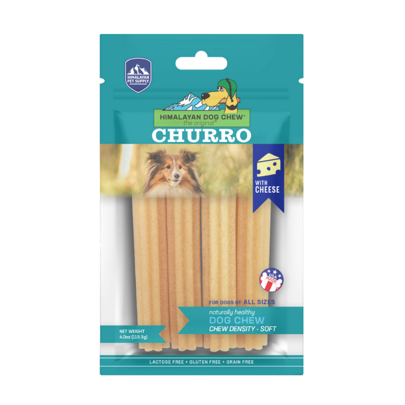 Himalayan Dog Chew CHURRO is the softest density chew, great for easy-going chewers and dogs of all ages and sizes. This savory treat is intended as a single chew session, providing your dog with the added benefit of oral support. Its unique shape gets between teeth to scrub and scrape, reducing plaque and tartar build-up. Himalayan Dog Chew Churro Cheese is lactose, grain, and gluten-free and is easily digestible.