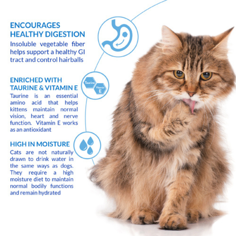 Water, Chicken, Tapioca Starch, Powdered Cellulose, Natural Flavors, Guar gum, Natural Scallop Flavor, Vitamin E Supplement, Taurine, Green Tea Extract.