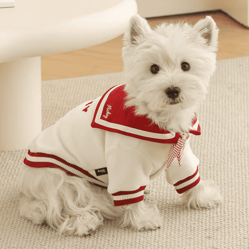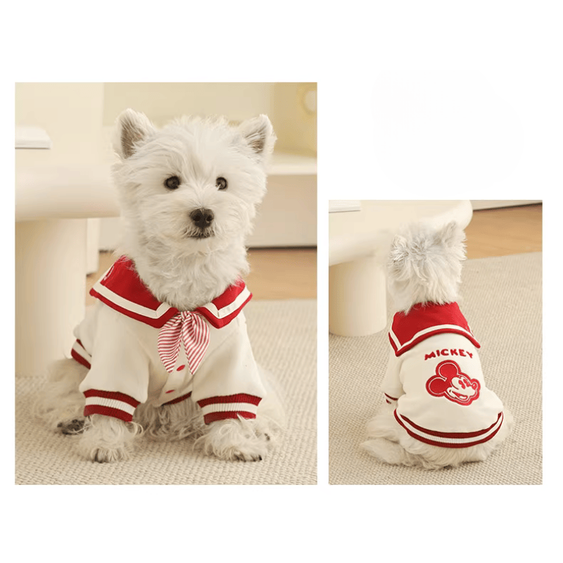 This Mickey-themed sailor outfit for pets is made from soft fleece, cozy sweatshirt fabric, and classic striped printed cloth. It offers a warm yet breathable fit — perfect for cold weather. The sailor collar design, combined with Mickey’s playful charm, makes your pet stand out in every walk!