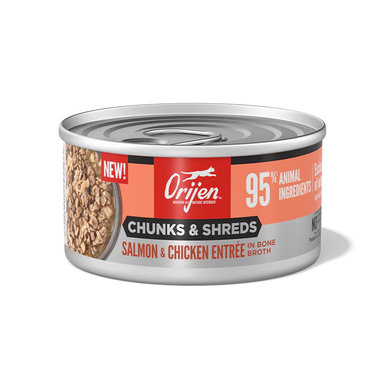 Nourish your cat completely with hearty WholePrey animal ingredients and real shreds of meat, poultry or fish in ORIJEN™ Chunks & Shreds Wet Cat Food! Cats are obligate carnivores, so they thrive off a diet packed with animal ingredients. That’s why our Salmon & Chicken Entrée recipe includes a whopping 95% animal ingredients1 to provide your cat with the Biologically Appropriate nourishment they were born to eat. This diet also includes succulent WholePrey ingredients like chicken liver to provide your cat with rich and varied nutrients. Bone broth helps support your cat’s hydration, while also adding tempting flavor. Nourish your cat with the texture and variety of raw animal ingredients packed into every can of ORIJEN™ Chunks & Shreds.