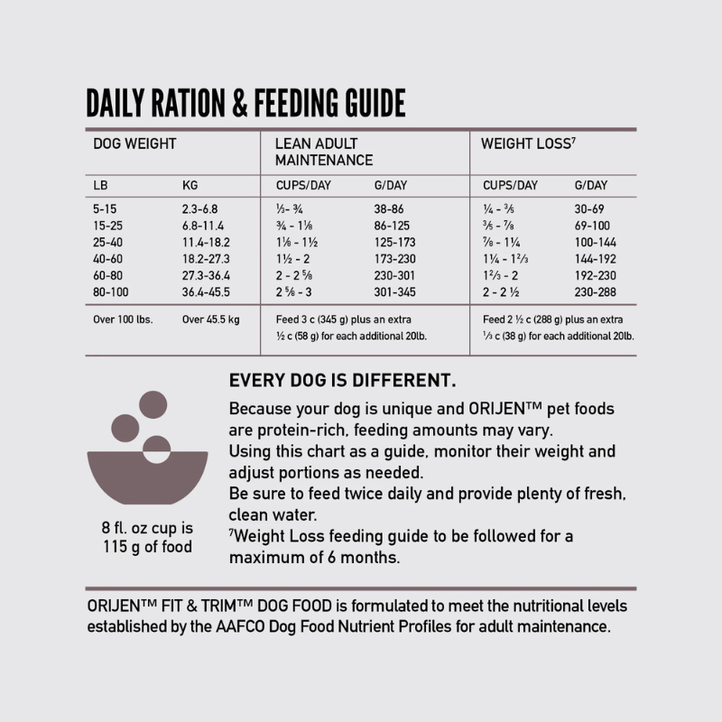 Help your dog thrive with the power of protein-rich recipes that provide peak nourishment. Dogs are ancestral carnivores, so they need a Biologically Appropriate diet packed with fresh or raw animal ingredients. ORIJEN™ Fit & Trim diet is Scientifically Tested to support weight loss* with tailored nutrition. Packed with WholePrey animal ingredients like organs and bone, ORIJEN food is made with the most nutrient-dense, succulent parts of the prey to deliver the nutrition dogs need. With 85% quality poultry & fish ingredients** and a freeze-dried coating, this diet is beyond comparison. The nourishing animal ingredients in this diet help support your dog’s Weight Loss, Immune Health, and Skin & Coat Health.
