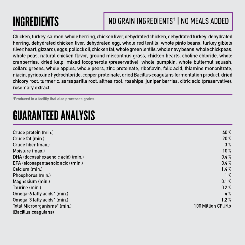 Chicken, turkey, salmon, whole herring, chicken liver, dehydrated chicken, dehydrated turkey, dehydrated herring, dehydrated chicken liver, dehydrated egg, whole red lentils, whole pinto beans, turkey giblets (liver, heart, gizzard), eggs, pollock oil, chicken fat, whole green lentils, whole navy beans, whole chickpeas, whole peas, natural chicken flavor, ground miscanthus grass, chicken hearts, choline chloride, whole cranberries, dried kelp, mixed tocopherols (preservative), whole pumpkin, whole butternut squash, collard greens, whole apples, whole pears, zinc proteinate, riboflavin, folic acid, thiamine mononitrate, niacin, pyridoxine hydrochloride, copper proteinate, dried Bacillus coagulans fermentation product, dried chicory root, turmeric, sarsaparilla root, althea root, rosehips, juniper berries, citric acid (preservative), rosemary extract.