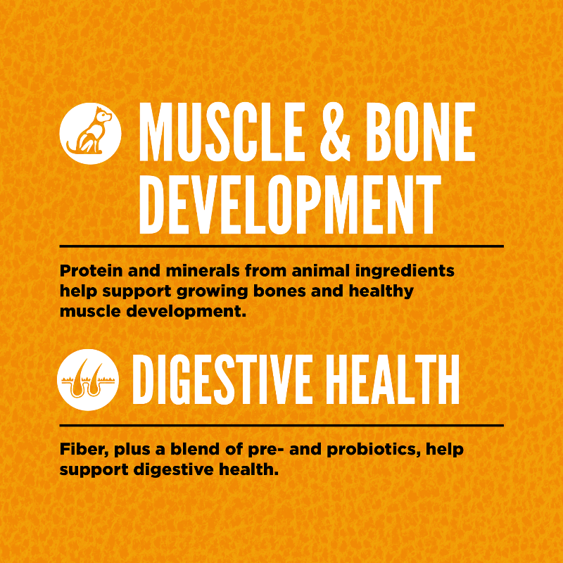 Help your puppy thrive with the power of protein-rich recipes that provide peak nourishment. All puppies do best on a Biologically Appropriate diet crafted with protein from fresh or raw animal ingredients, and this diet is specially tailored to support your puppy’s growth and brain development. ORIJEN® Puppy diet is crafted with 85%* quality animal ingredients like fresh or raw free-run** chicken and turkey and wild-caught fish. Packed with WholePrey animal ingredients like organs, ORIJEN food is made with the most nutrient-dense, succulent parts of the prey to deliver the nutrition puppies need. The nutrient-dense animal ingredients in this diet help support your puppy’s Brain Development, Muscle & Bone Development and Digestive Health. The result is a diet for your canine companion that is beyond comparison.