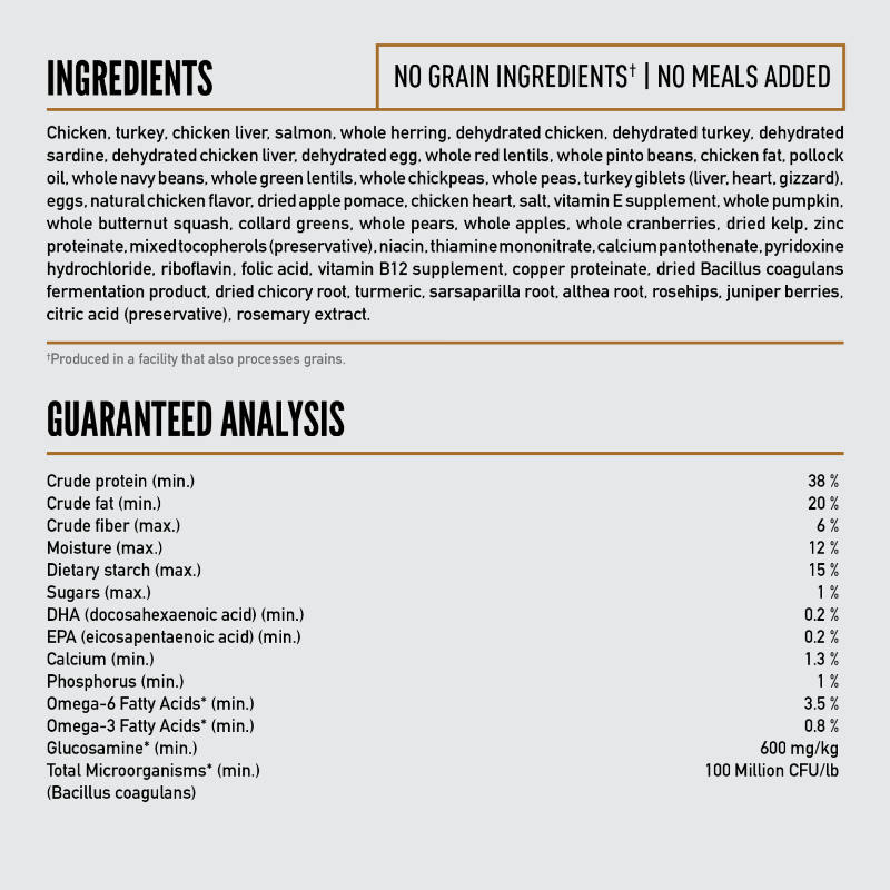 Chicken, turkey, chicken liver, salmon, whole herring, dehydrated chicken, dehydrated turkey, dehydrated sardine, dehydrated chicken liver, dehydrated egg, whole red lentils, whole pinto beans, chicken fat, pollock oil, whole navy beans, whole green lentils, whole chickpeas, whole peas, turkey giblets (liver, heart, gizzard), eggs, natural chicken flavor, dried apple pomace, chicken heart, salt, vitamin E supplement, whole pumpkin, whole butternut squash, collard greens, whole pears, whole apples, whole cranberries, dried kelp, zinc proteinate, mixed tocopherols (preservative), niacin, thiamine mononitrate, calcium pantothenate, pyridoxine hydrochloride, riboflavin, folic acid, vitamin B12 supplement, copper proteinate, dried Bacillus coagulans fermentation product, dried chicory root, turmeric, sarsaparilla root, althea root, rosehips, juniper berries, citric acid (preservative), rosemary extract.