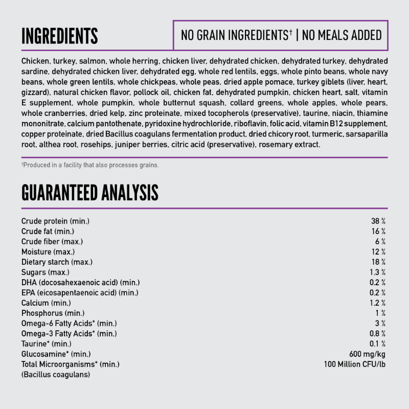 Chicken, turkey, salmon, whole herring, chicken liver, dehydrated chicken, dehydrated turkey, dehydrated sardine, dehydrated chicken liver, dehydrated egg, whole red lentils, eggs, whole pinto beans, whole navy beans, whole green lentils, whole chickpeas, whole peas, dried apple pomace, turkey giblets (liver, heart, gizzard), natural chicken flavor, pollock oil, chicken fat, dehydrated pumpkin, chicken heart, salt, vitamin E supplement, whole pumpkin, whole butternut squash, collard greens, whole apples, whole pears, whole cranberries, dried kelp, zinc proteinate, mixed tocopherols (preservative), taurine, niacin, thiamine mononitrate, calcium pantothenate, pyridoxine hydrochloride, riboflavin, folic acid, vitamin B12 supplement, copper proteinate, dried Bacillus coagulans fermentation product, dried chicory root, turmeric, sarsaparilla root, althea root, rosehips, juniper berries, citric acid (preservative), rosemary extract.