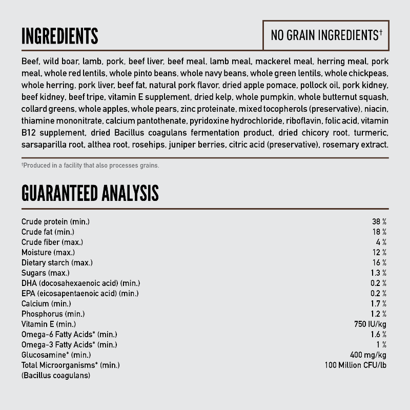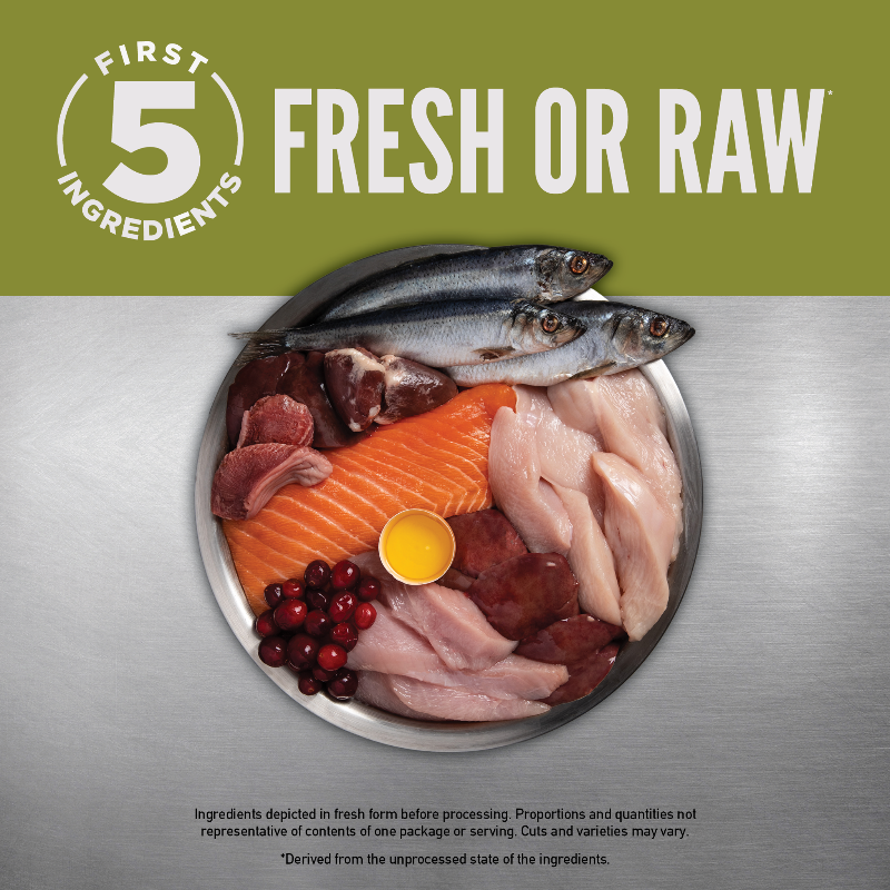 Chicken, turkey, salmon, whole herring, chicken liver, dehydrated chicken, dehydrated sardine, dehydrated chicken liver, dehydrated egg, whole red lentils, whole pinto beans, whole navy beans, whole green lentils, whole chickpeas, whole peas, dried apple pomace, turkey giblets (liver, heart, gizzard), eggs, dehydrated turkey, natural chicken flavor, dehydrated pumpkin, pollock oil, chicken fat, lentil fiber, chicken heart, vitamin E supplement, whole pumpkin, whole butternut squash, collard greens, whole apples, whole pears, whole cranberries, dried kelp, zinc proteinate, mixed tocopherols (preservative), niacin, thiamine mononitrate, calcium pantothenate, pyridoxine hydrochloride, riboflavin, folic acid, vitamin B12 supplement, copper proteinate, dried Bacillus coagulans fermentation product, dried chicory root, turmeric, sarsaparilla root, althea root, rosehips, juniper berries, citric acid (preservative), rosemary extract.