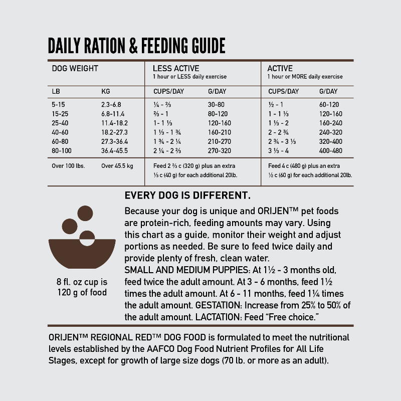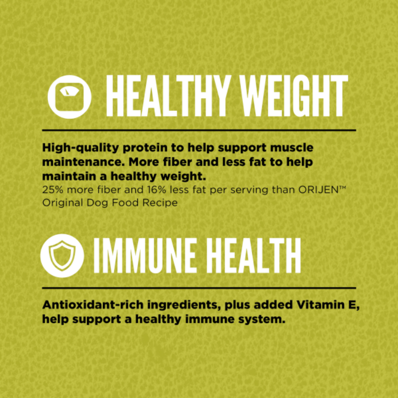 Help your dog thrive with the power of protein-rich recipes that provide peak nourishment. Dogs are ancestral carnivores, so they need a Biologically Appropriate diet packed with fresh or raw animal ingredients. ORIJEN® Senior diet is tailored to help support maintaining a healthy weight and joint function in senior dogs. Packed with WholePrey animal ingredients like organs and bone, ORIJEN food is made with the most nutrient-dense, succulent parts of the prey to deliver the nutrition dogs need. With 85% quality animal ingredients* like free-run** chicken, turkey, wild-caught fish, and a freeze-dried coating, this diet is beyond comparison. The nourishing animal ingredients in our Senior diet help support your senior dog’s Joint Health, Healthy Weight and Immune Health.