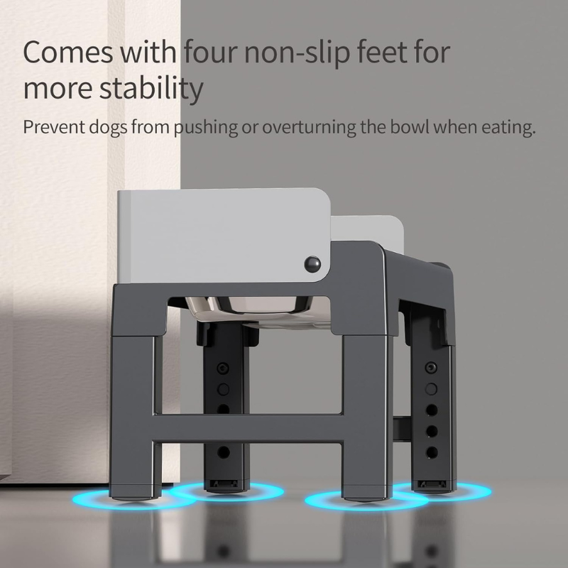 Make mealtime more comfortable for your dog – the Pakeway lifting bowl stand features five adjustable height levels (from approx. 8 cm to 30 cm), suitable for dogs and cats of various sizes and life stages. The tiltable design helps reduce strain on the neck and joints, promoting healthier digestion. For best results, we recommend adjusting the rear legs two levels higher than the front to create a 10° tilt angle.