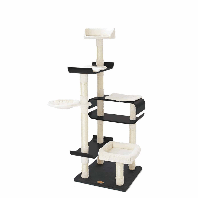 Give your cat the ultimate playground with the Petio Add Mate Villa Fort Cat Scratching Tree Tall. This multi-level cat tower combines function and style with a sleek black-and-white color scheme and a well-thought-out layout. Designed to provide climbing, lounging, and scratching options, it keeps cats active, entertained, and comfortable. Featuring multiple platforms, cozy perches, a hammock, and durable sisal-covered posts for natural claw maintenance.