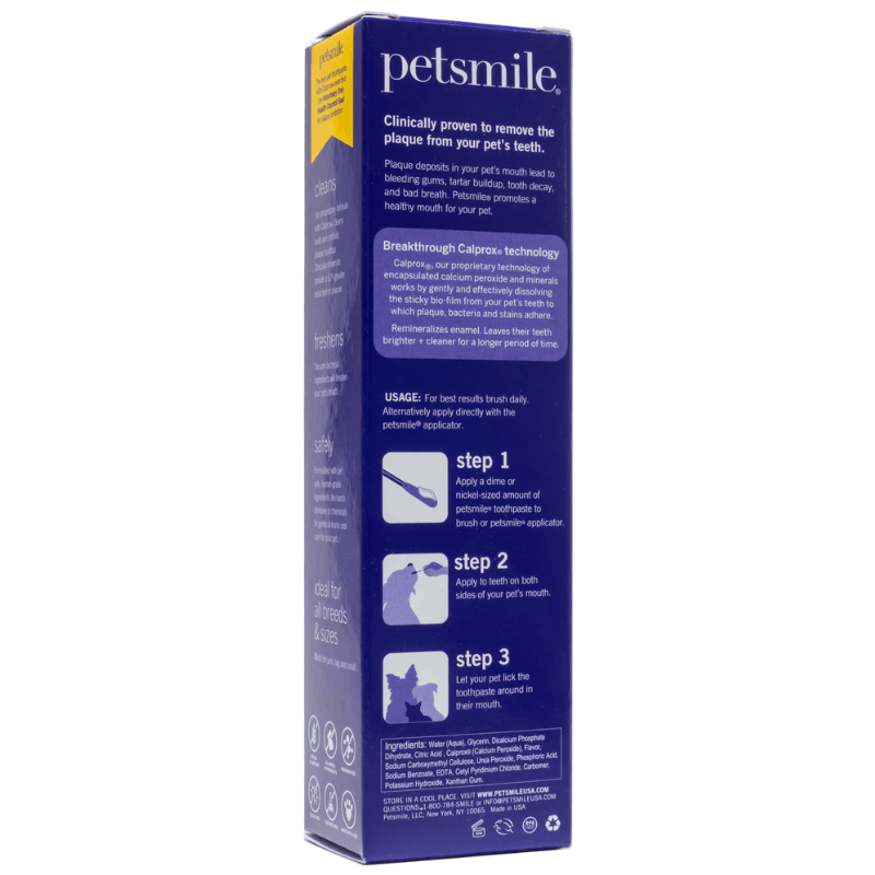 Petsmile is made in the USA with human-grade ingredients. It contains calcium, magnesium, phosphates, to re-mineralize enamel. Petsmile is BPA-free, silica-free, sulfate-free, paraben-free, gluten-free, allergy-free, and vegan.