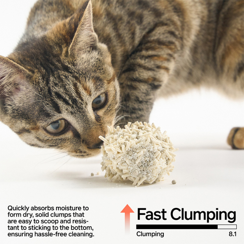 The tofu litter rapidly absorbs moisture, bentonite clay forms firm and scoopable clumps, while cassava starch enhances overall structure and reduces residue buildup. Together, this carefully balanced blend provides a cleaner, more comfortable litter experience for both cats and owners.