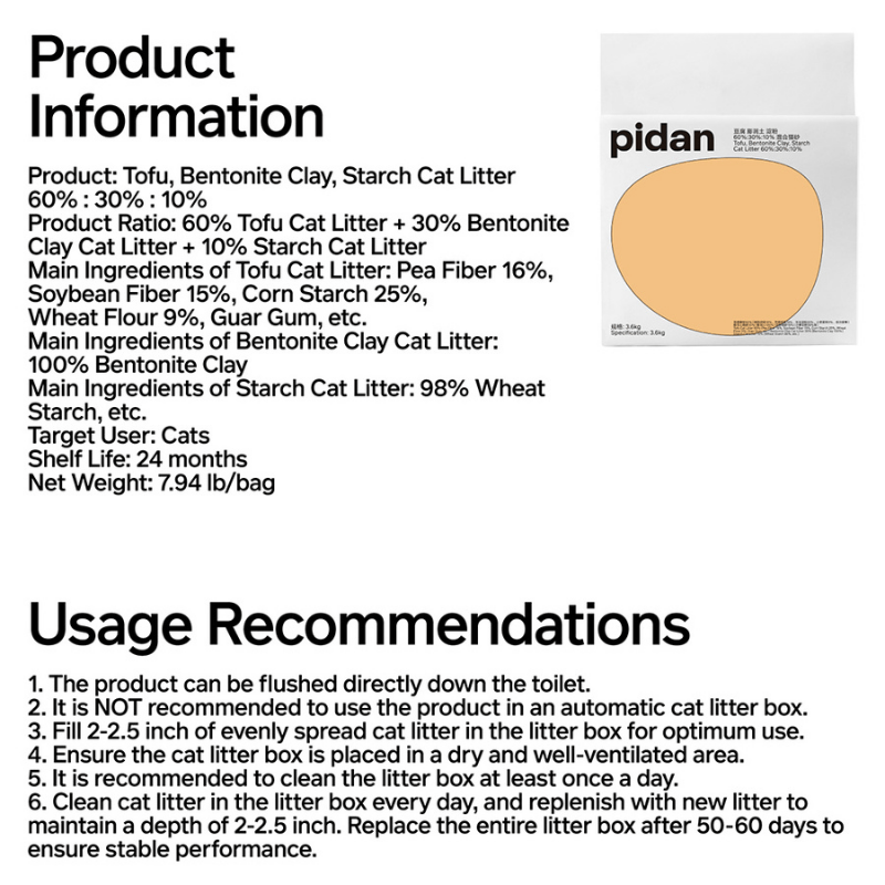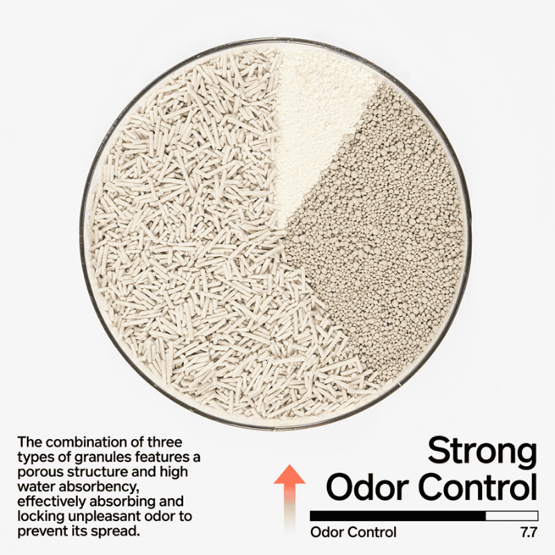 Crafted with a balanced 60% tofu litter, 30% bentonite clay, and 10% starch litter formula, this composite blend delivers strong clumping, excellent odor control, minimal dust, and improved environmental friendliness.