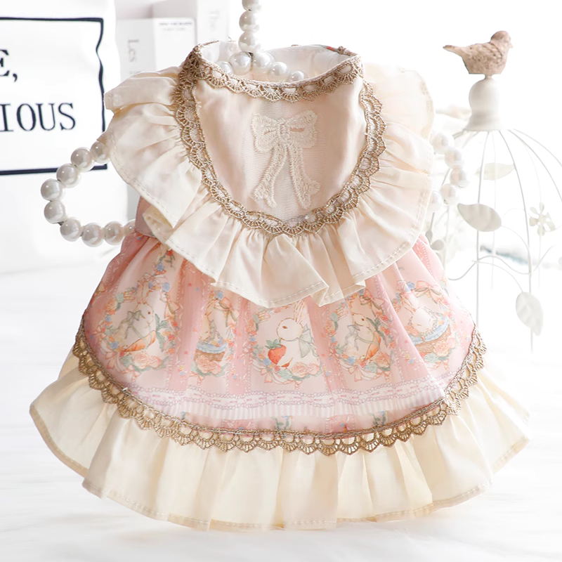 Adorned with an adorable rabbit pattern, this dress adds a playful touch, making it perfect for various occasions—whether it’s a party, festive celebration, or everyday wear. Your pet will shine with unique charm. The design emphasizes intricate details, with beautiful lace and a layered skirt that makes every turn feel like a graceful dance.