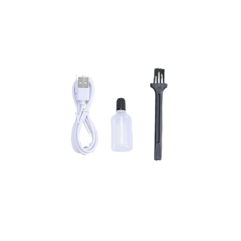 Contains a Feet Hair Trimmer, a bottle of lube, a USB charging cable and a brush