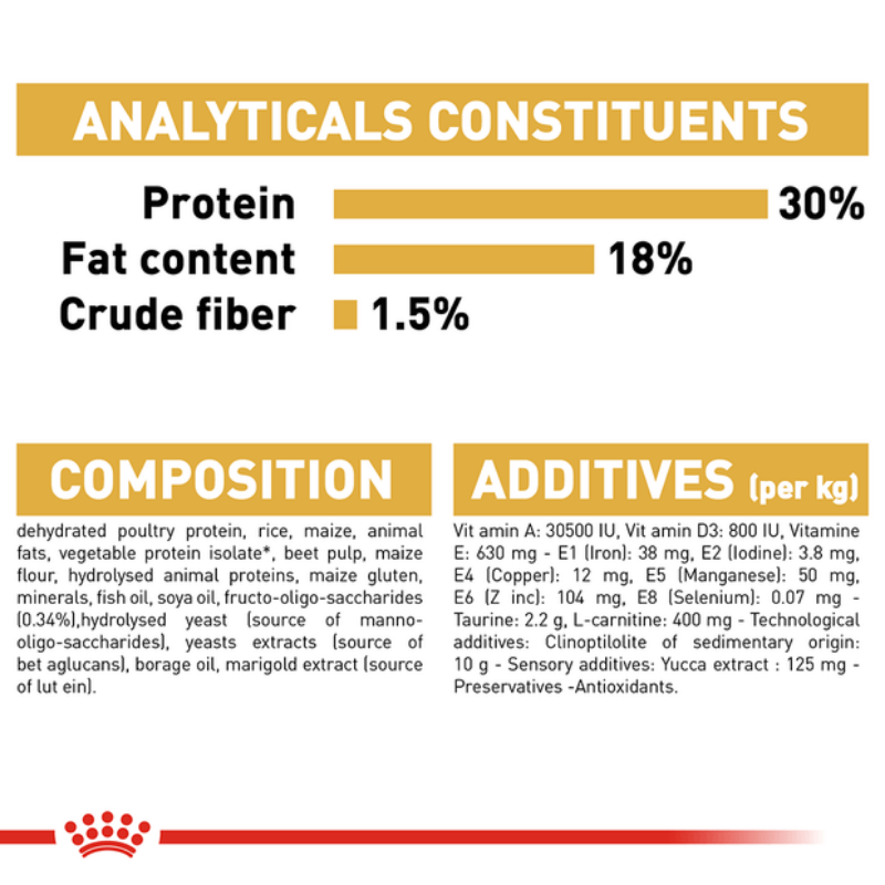 Composition:Dehydrated poultry protein, rice, animal fats, vegetable protein isolate*, maize, beet pulp, maize flour, hydrolysed animal proteins, maize gluten, minerals, fish oil, soya oil, fructo-oligo-saccharides (0,34%), hydrolysed yeast (source of manno-oligo-saccharides), yeasts extracts (source of betaglucans), marigold extract (source of lutein).