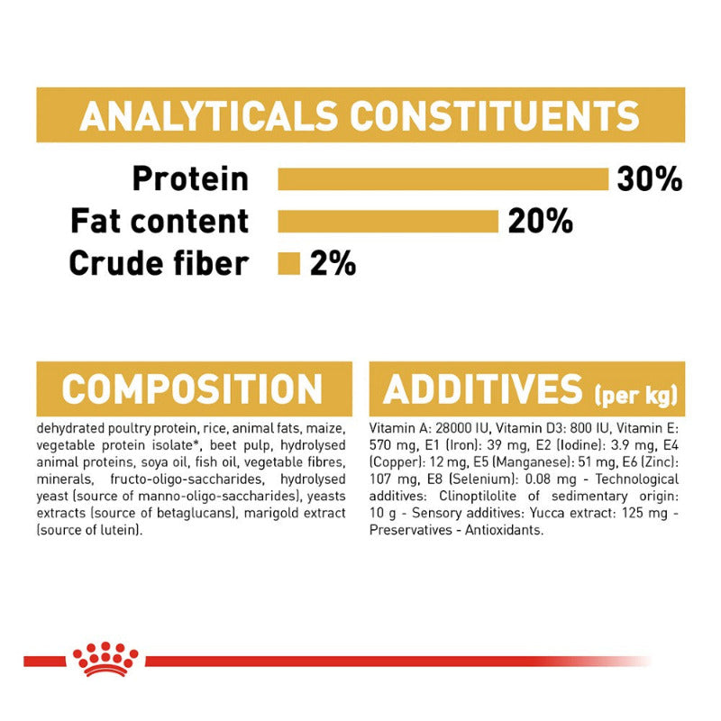 Dehydrated poultry protein, rice, animal fats, maize, vegetable protein isolate*, beet pulp, hydrolysed animal proteins, minerals, soya oil, fish oil, vegetable fibres, fructo-oligo-saccharides, hydrolysed yeast (source of mannooligosaccharides), marigold extract (source of lutein). *L.I.P.: protein selected for its very high assimilation.