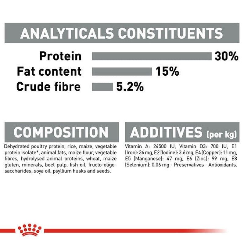 dehydrated poultry meat, rice, maize, vegetable fibres, animal fats, maize gluten, vegetable protein isolate*, hydrolysed animal proteins, beet pulp, fish oil, fructo-oligo-saccharides, soya oil, psyllium husks and seeds.