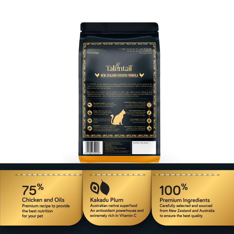 Formulated with 75% Chicken and Oils to more closely mirror the natural diet of your cat's accestors. 100% premium ingredients, carefully selected and sourced from Australia and New Zealand to ensure the best quality. Includes Kakadu Plum, an Australian native superfood, to help support your cat's immune system.