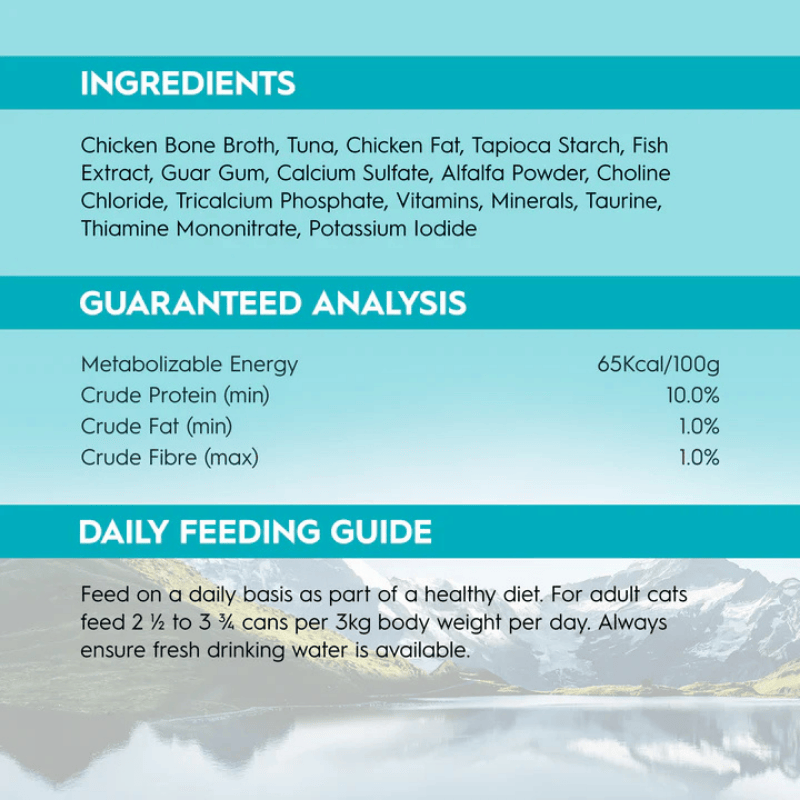 Chicken Bone Broth, Tuna, Tapioca Starch, Chicken Fat, Tricalcium Phosphate, Fish Extract, Guar Gum, Alfalfa Powder, Fish Oil, Minerals, Choline Chloride, Vitamins, Magnesium Sulfate, Taurine, Thiamine Mononitrate, Potassium Iodide