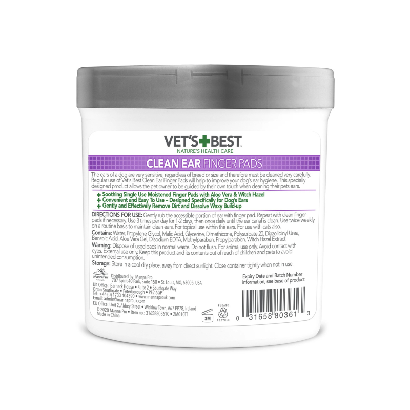 A dog’s and cat's ears are very sensitive, regardless of breed or size and must be cleaned very carefully. Regular use of Vet’s Best® Ear Relief Finger Wipes will help to safely & gently remove wax buildup, dirt and discharge which can cause odor. This specially designed product allows the pet owner to be guided by their own touch when cleaning their pet's ears.