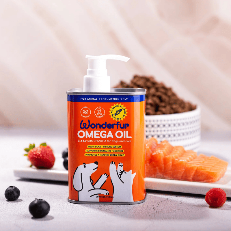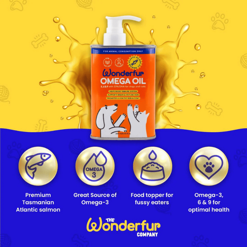 Give your furry friend the daily boost they deserve! Wonderfur Omega Oil is a premium, all-natural supplement rich in Omega-3, 6, and 9 fatty acids. Sourced from high-quality Tasmanian Atlantic Salmon, it supports your pet’s overall wellness — from a strong immune system to healthy skin, joints, brain, and heart.