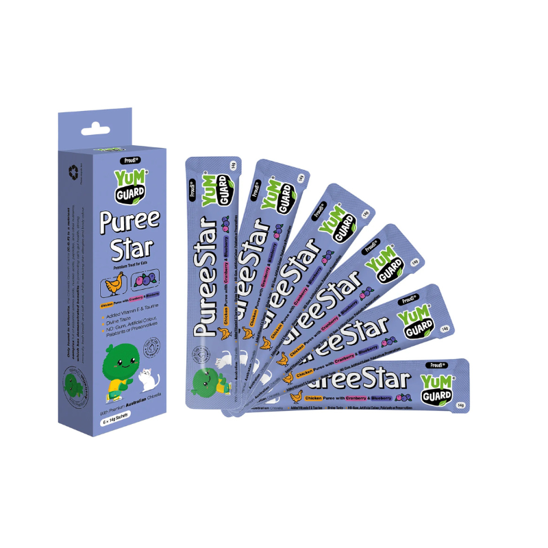 YumGuard Puree Star series features fresh chicken blended with antioxidant-rich cranberries and blueberries, offering cats a perfect balance of taste and nutrition. The smooth, creamy texture makes it highly palatable – ideal as a daily reward or a tasty meal topper.