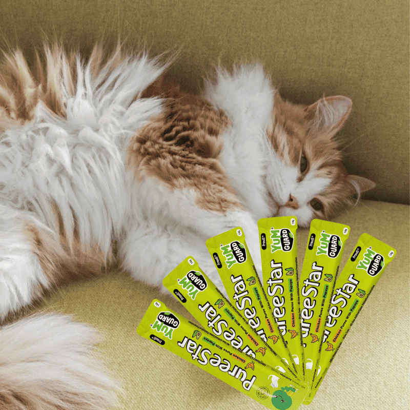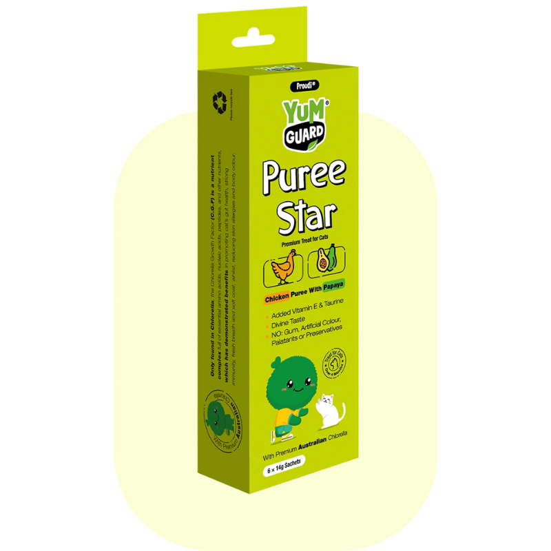 Give your cat a treat they'll love with YumGuard's Puree Star Chicken with Papaya. Packed with essential vitamins, minerals, and Premium Australian Chlorella to support tissue growth and repair. With a smooth texture and rich taste, it's a treat your cat will adore!