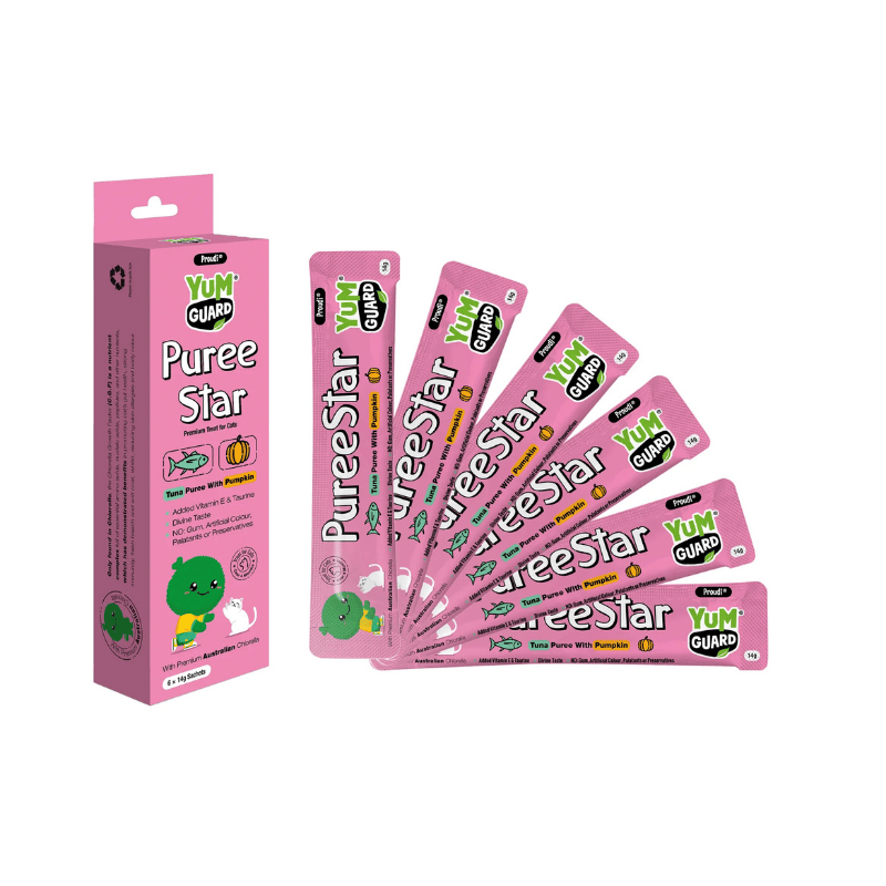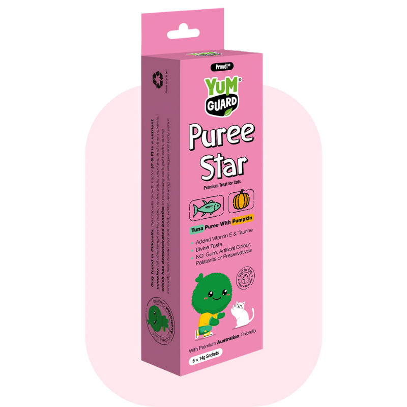 Give your cat a treat they'll love with YumGuard's Puree Star Tuna with Pumpkin. Packed with essential vitamins, minerals, and Premium Australian Chlorella to support tissue growth and repair. With a smooth texture and rich taste, it's a treat your cat will adore!