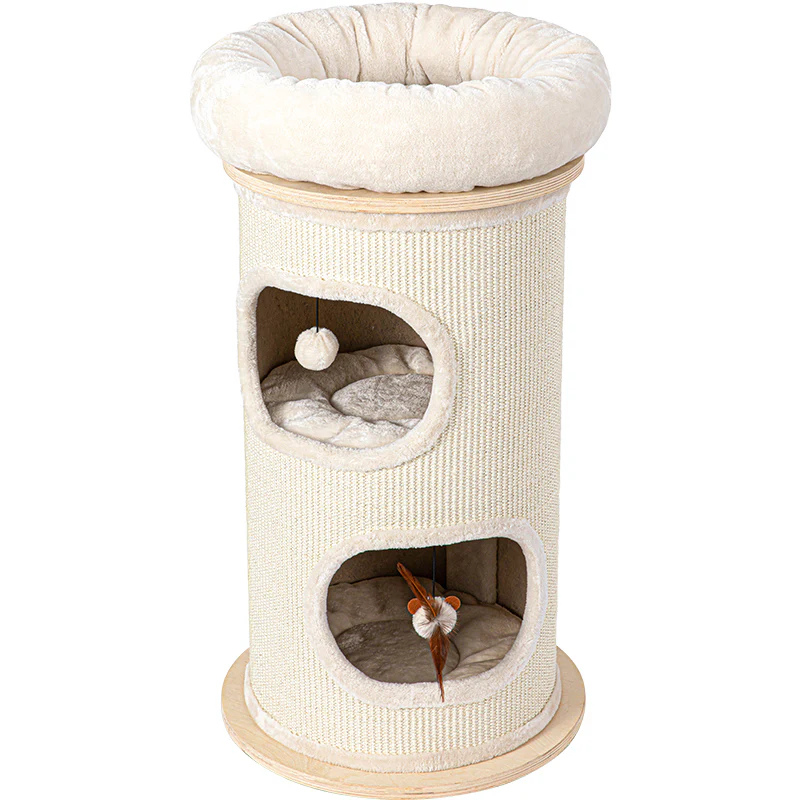 The Honeypotcat Cosy Sisal Barrel is a stylish and functional compact cat furniture piece designed to suit modern homes. Standing at 89cm, it features a sturdy sisal-wrapped exterior for scratching, keeping your cat’s claws healthy while protecting your furniture. The interior provides a cozy hideaway with soft plush lining, perfect for naps or quiet time. The plush top offers an elevated lounging area where your cat can relax and observe their surroundings. Its compact design ensures it fits well in smaller spaces while still providing ample enjoyment for your feline friend.